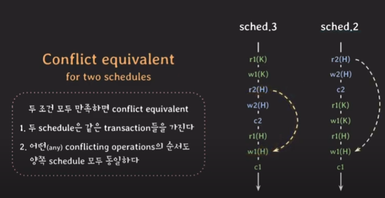 - 어떤(any) conflicting operations의 순서도 양쪽 스케줄 모두 동일하다.