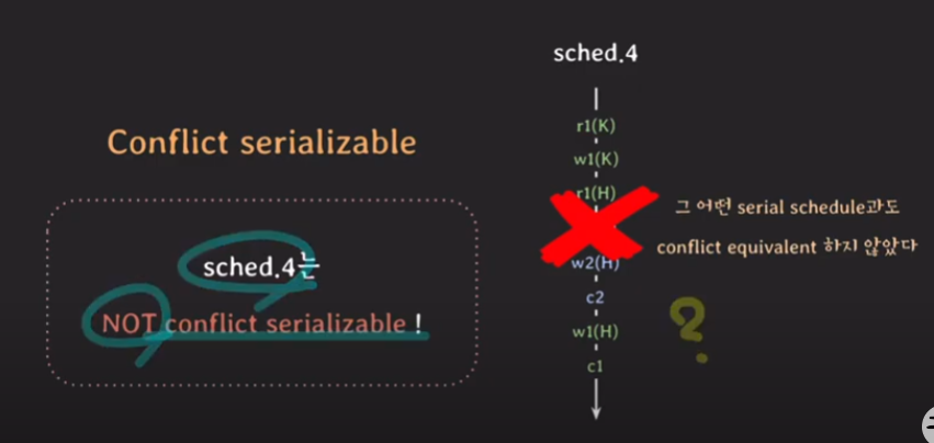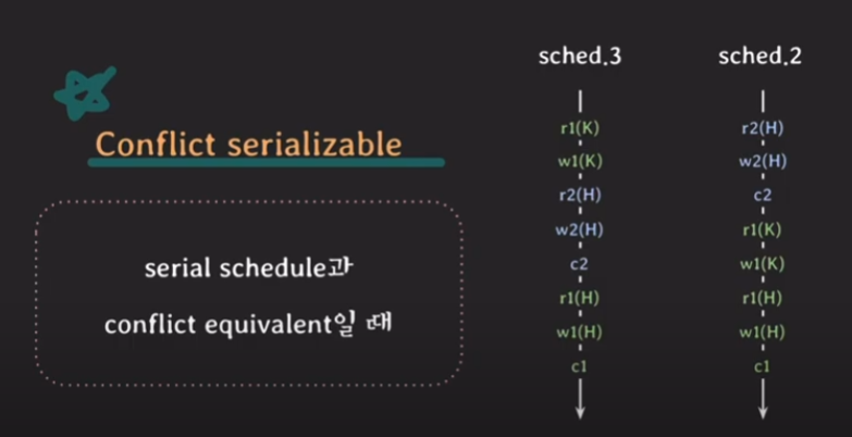 결국, non-serial schedule이 serial schedule과 conflict equivalent 하다는 것은 최종적으로 그 해당 스케줄 여기서는 스케줄 3이 confilct serializable하다는 뜻입니다.