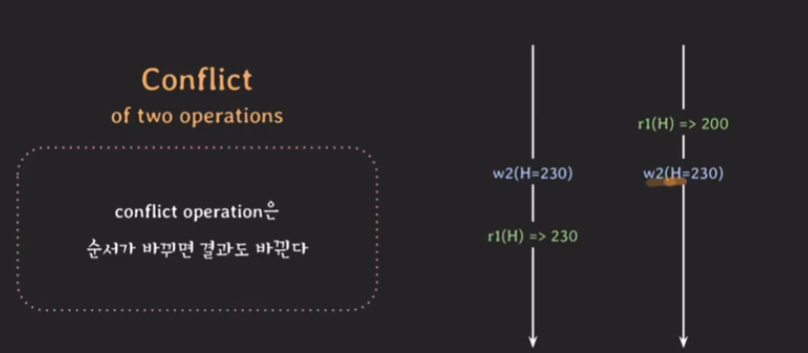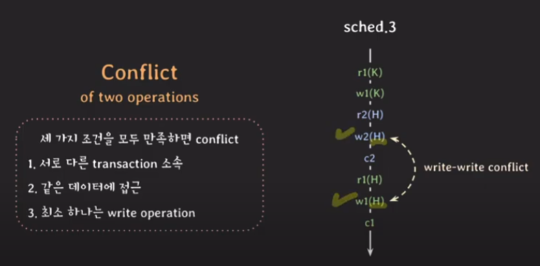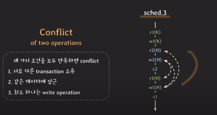 그러면 동일하다는 무슨 의미일까요? 우선, 두 개의 operation에 대한 conflict 개념에 대해서 알아보겠습니다. 세 가지 조건을 모두 만족하면 conflict라고 합니다.