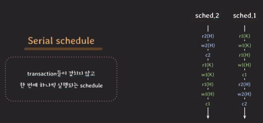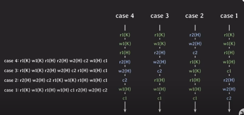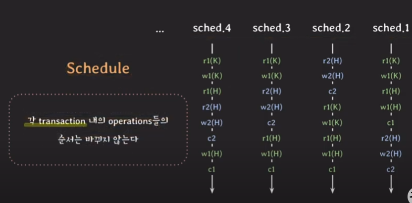 결국 이 case 각각이 스케줄이라는 것입니다. 그리고 중요한 특징중 하나는 각 트랜잭션 내의 operation들의 실행 순서는 바뀌지 않는다는 점입니다.