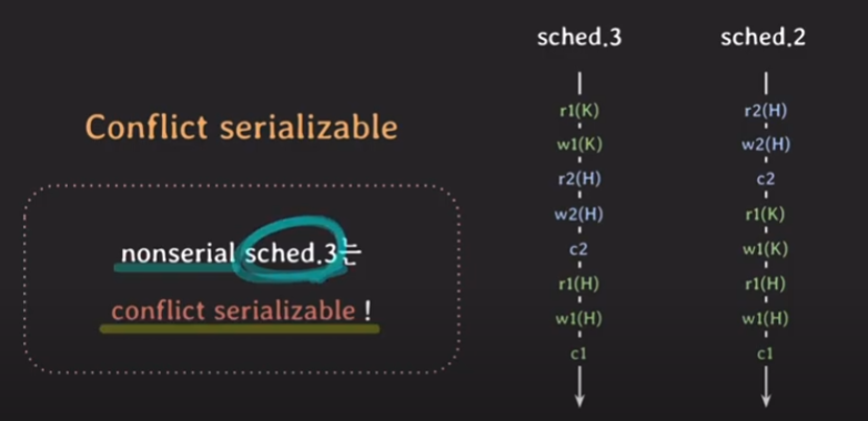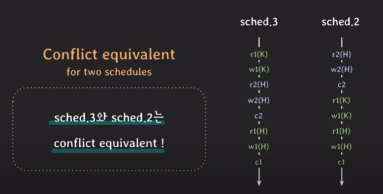 자세히 보면 스케줄 2는 serial schedule입니다. 그래서 스케줄 3입장에서는 serial schedule과 conflicting equivalent한 것입니다. 이를 conflict serializable이라고 합니다. 이 개념이 매우 중요합니다.