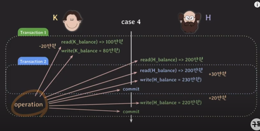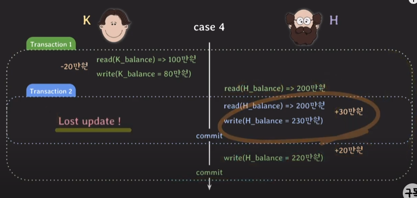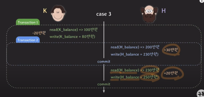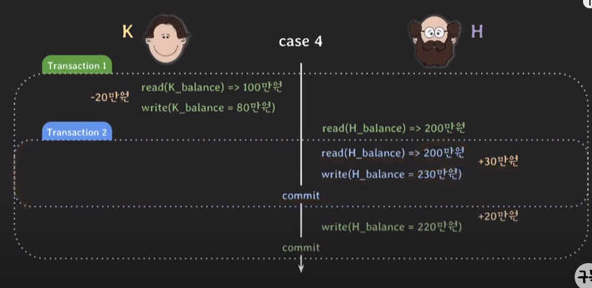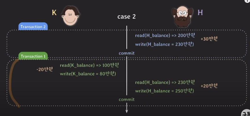 이번에는 20만원을 송금하는 트랜잭션을 먼저 시작을 했습니다. 그래서 K측에서 먼저 read, write을 하였습니다. 그러면 H에서 20만원 받은 것에 대한 read, write 과정을 거쳐야하는데, 이때 하필 ATM기에서 30만원을 입금하는 트랜잭션이 발생한 것입니다. 그래서 두 번째 트랜잭션이 완료가 된 후 이전에 처리하지 못했던 20만원에 대해서 처리하게 되는 것입니다.