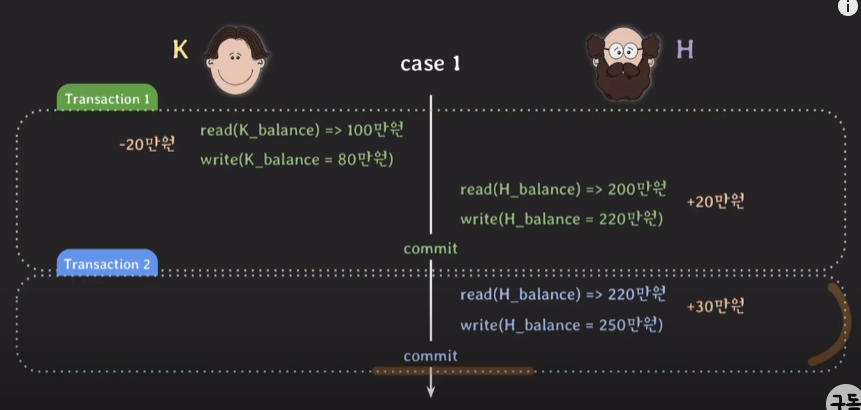 K의 트랜잭션이 발생한 이후에 H의 트랜잭션이 발생하는 경우 입니다. 즉 K에서 read, write, commit 한 후 H에서 read, write하고 commit하는 순서입니다.