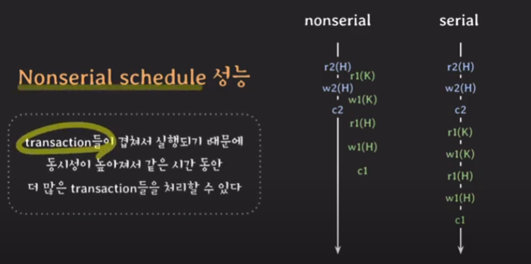 그럼 이번에는 Nonserial schedule의 성능에 대해서 알아보겠습니다. I/O 작업을 하는 동안 다른 트랜잭션을 처리하느라 CPU는 놀지 않기 때문에 성능이 효율적입니다. 그래서 여러 트랜잭션을 동시에 처리할 수 있기 때문에 성능적인 측면이 좋게 됩니다.
