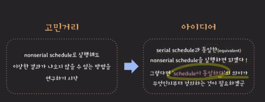 그래서 nonserial schedule로 실행을 해도 이상한 결과가 나오지 않을 수 있는 방법을 생각하게 되었습니다. serial schedule은 이상한 결과는 만들지 않기 때문에 serial schedule과 동일한(equivalent) nonseiral schedule을 실행하면 되겠다! 라는 생각을 하게 되었습니다.