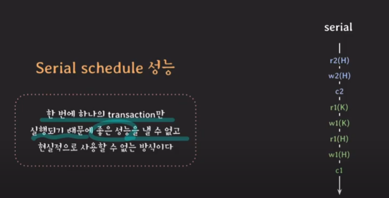 - 추가적으로 어떠한 스케줄도 serializable하게 만드는 것이 바로 concurrency control입니다. 그리고 이와 관련된 속성이 isolation입니다. *지나친 isolation은 동시성이 사라지기 때문에 성능이 떨어지게 됩니다.