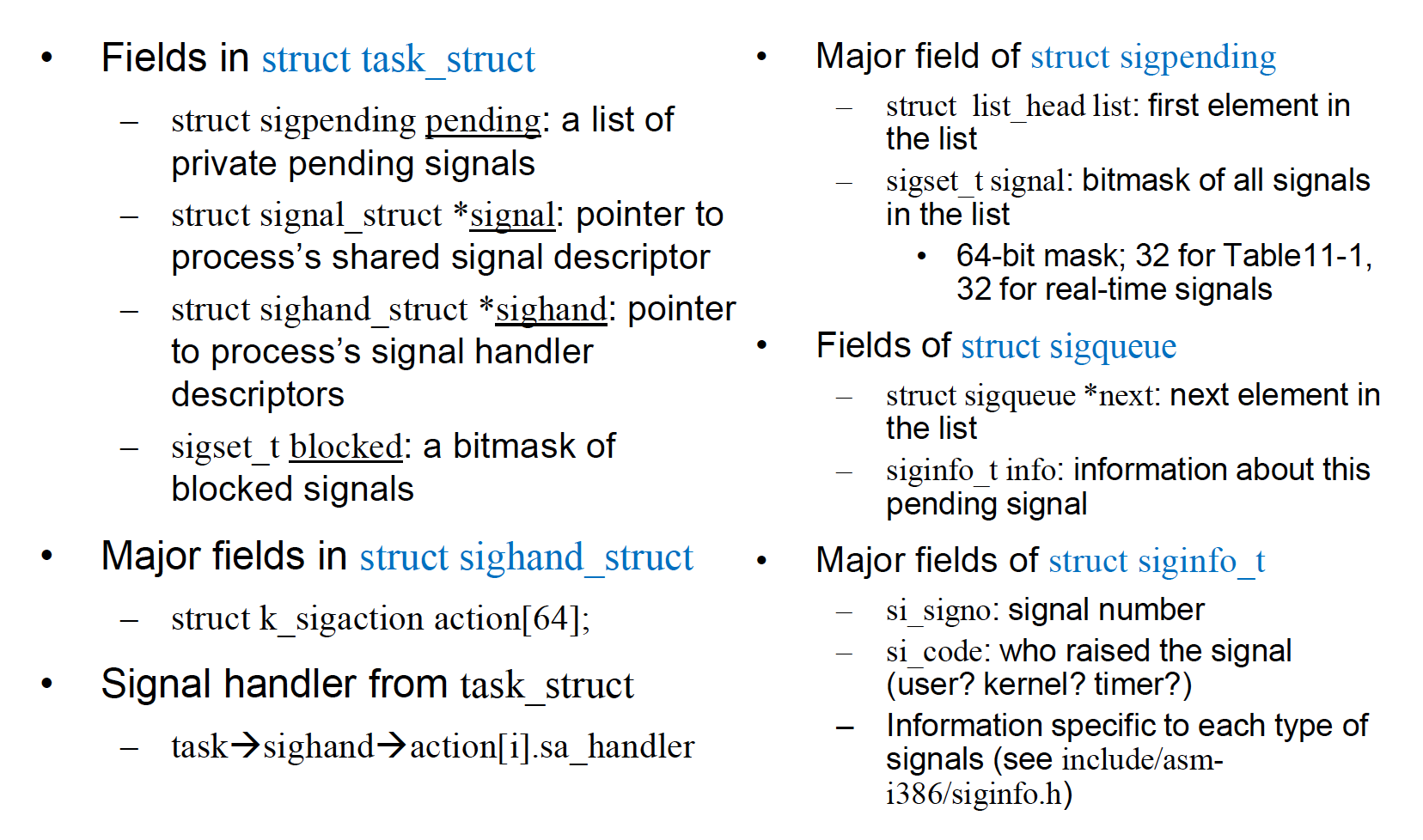 - struct sighand_struct (*sighand): 프로세스의 시그널 핸들러 디스크립터를 가리키는 포인터