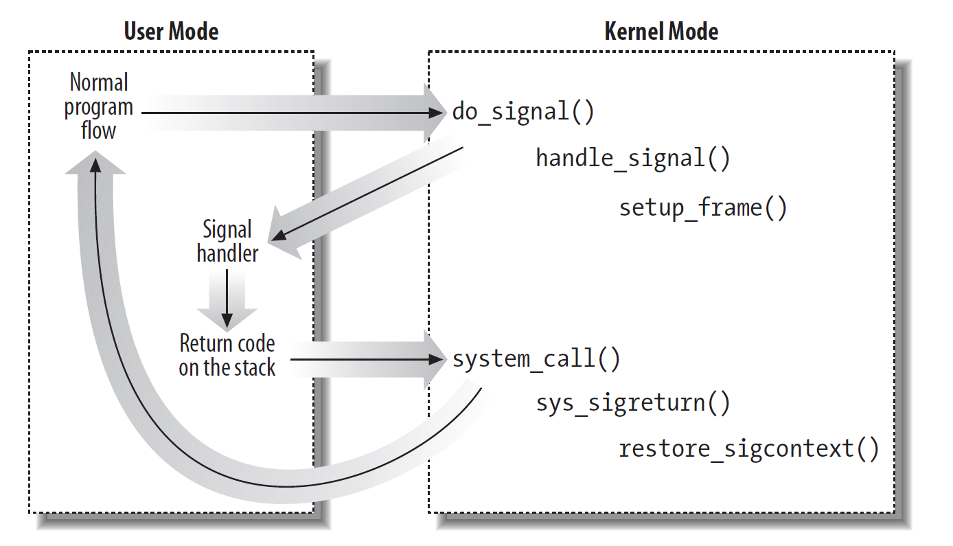 - The User Mode stack is also modified in such a way that, when the signal handler terminates, the sigreturn()system call is automatically invoked to copy the hardware context back on the Kernel Mode stack and restore the original content of the User Mode stack.