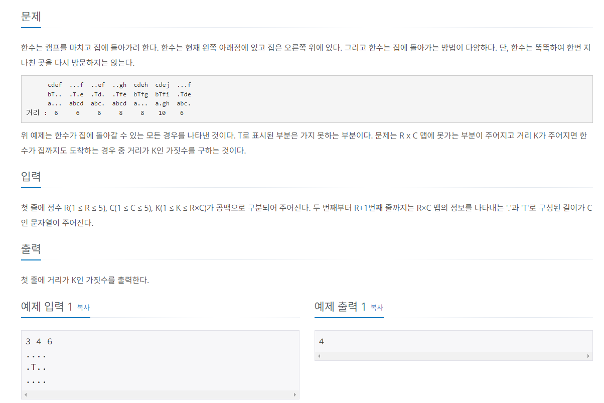 R x C 맵에 못가는 부분 T가 주어지고 거리 K가 주어지면 한수가 집까지도 도착하는 경우 중 거리가 K인 가짓수를 구하는 것.