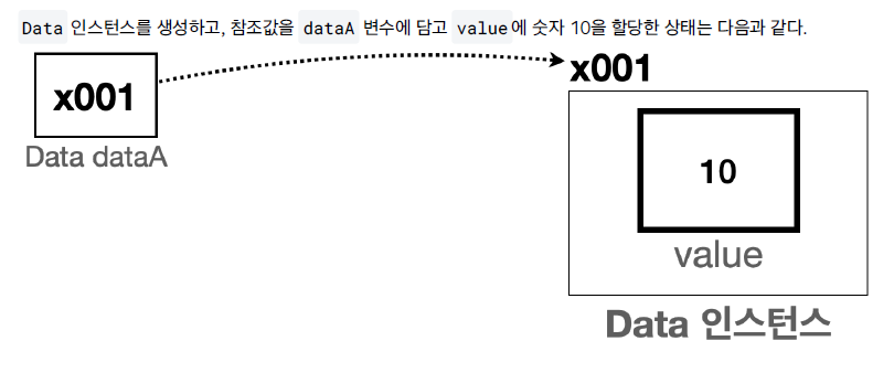 dataA 변수는 Data 클래스를 통해서 만들었기 때문에 참조형이다. 이 변수는 Data 타입의 객체의 참조값을 저장한다. Data객체를 생성하고, 객체의 위치를 가리키는 참조값을 dataA에 저장한다. 그리고 이 참조값을 사용해서 객체의 value변수에 10을 저장한다.
