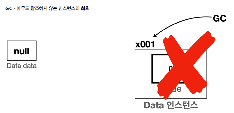 null을 할당하면 어떤 인스턴스도 참조하지 않게 된다. 그렇기 때문에 인스턴스에 접근할 방법이 없다. 아무도 참조하지 않는 인스턴스는 메모리 용량만 차리할 뿐이기 때문에 가비지 컬렉션이 해당 인스턴스를 자동으로 메모리에서 제거해 준다.