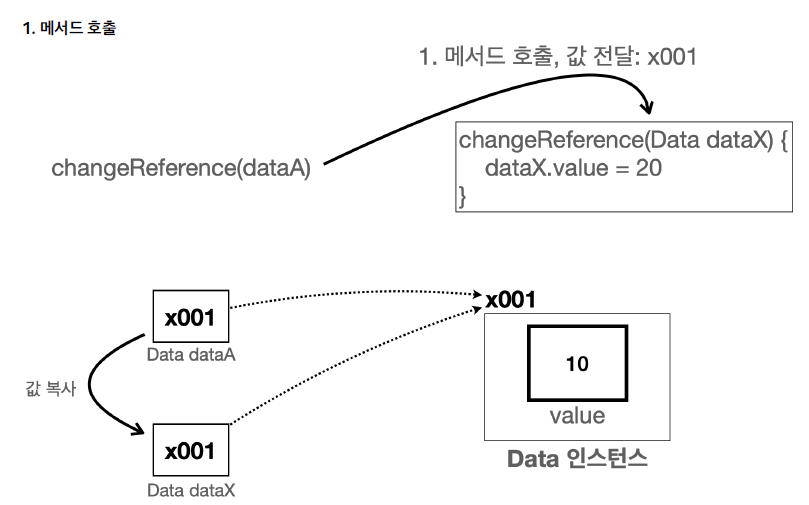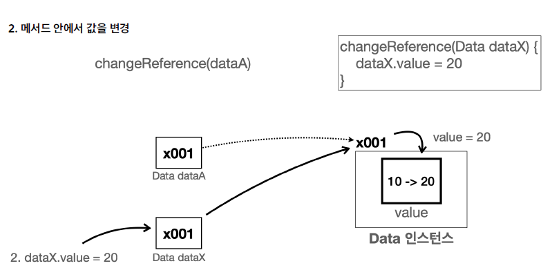 메서드 안에서 dataX.vale = 20으로 새로운 값을 대입한다. 그리고 참조값을 통해 x001에 있는 인스턴스에 접근하고 그 안에 있는 value의 값을 20으로 변경한다. dataA와 dataX 모두 같은 x001 인스턴스를 참조하기 때문에 dataA.value와 dataX.value는 둘다 20이라는 값을 갖게 된다.