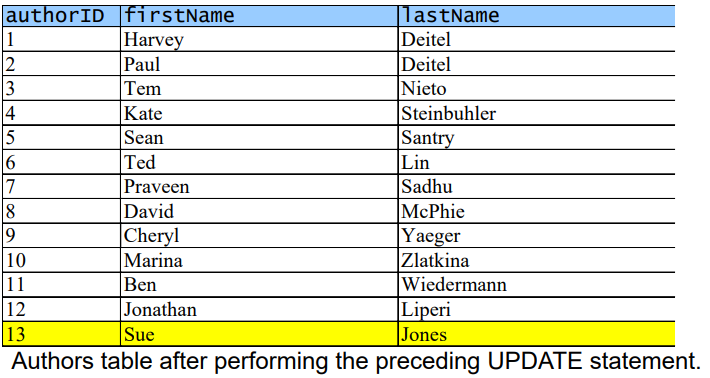 UPDATE Authors SET lastName = 'Jones' WHERE lastName = 'Smith'AND firstName = 'Sue';