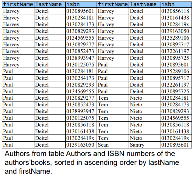ON Authors.authorID = AuthorISBN.authoID ORDER BY lastName, firstName