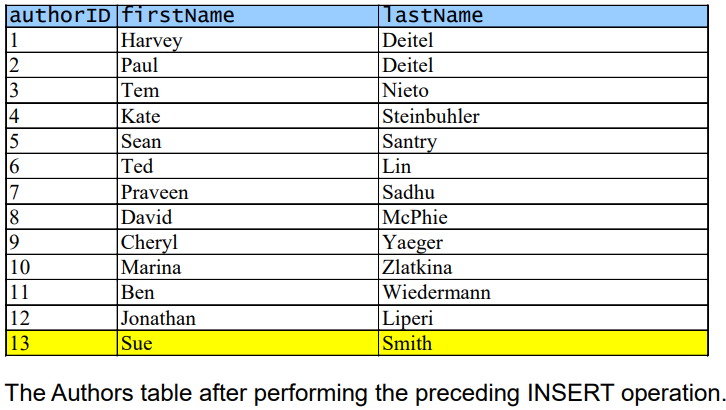 INSERT INTO Authors(firstName, lastName) VALUES('Sue', 'Smith');