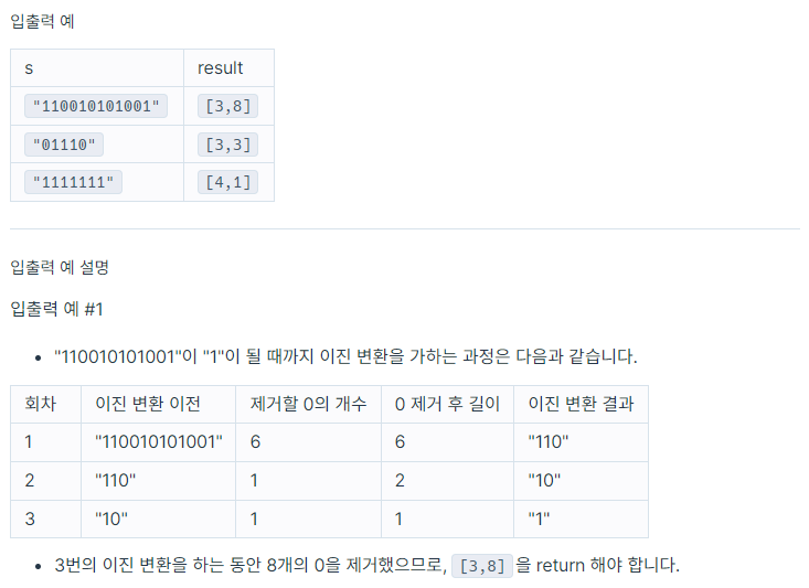 0과 1로 이루어진 문자열 s가 매개변수로 주어집니다. s가 "1"이 될 때까지 계속해서 s에 이진 변환을 가했을 때, 이진 변환의 횟수와 변환 과정에서 제거된 모든 0의 개수를 각각 배열에 담아 return 하도록 solution 함수를 완성해주세요.