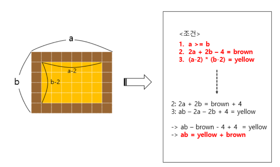 Leo가 본 카펫에서 갈색 격자의 수 brown, 노란색 격자의 수 yellow가 매개변수로 주어질 때 카펫의 가로, 세로 크기를 순서대로 배열에 담아 return 하도록 solution 함수를 작성해주세요.