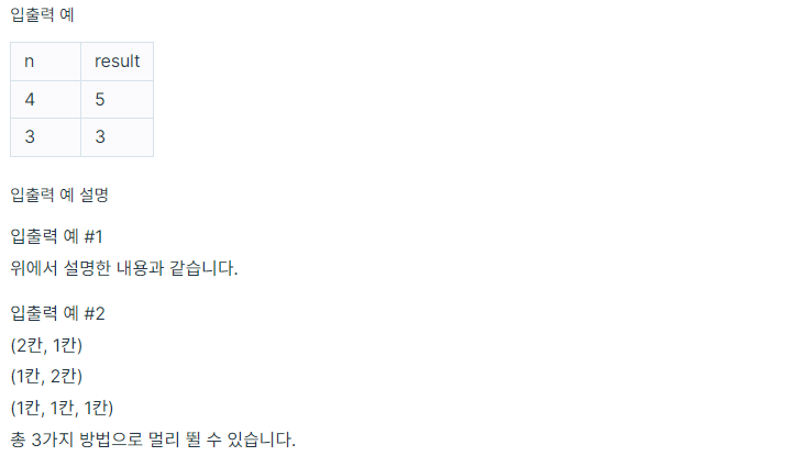 효진이는 멀리 뛰기를 연습하고 있습니다. 효진이는 한번에 1칸, 또는 2칸을 뛸 수 있습니다. 칸이 총 4개 있을 때, 효진이는