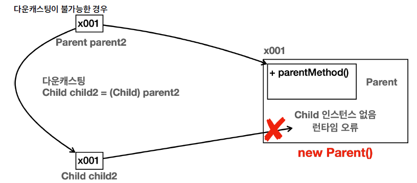 parent1의 경우 다운캐스팅을 해도 문제가 되지 않는다. 하지만 아래 경우는 다운캐스팅이 불가능 하다.