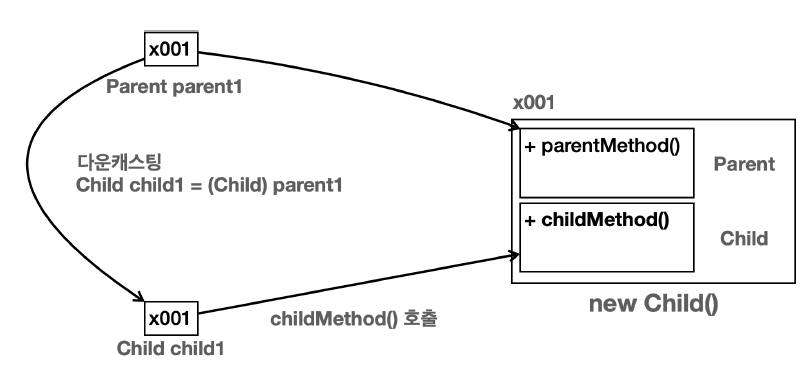 ((Child) x001).childMethod(); // 참조값을 읽은 다음 자식 타입으로 다운캐스팅