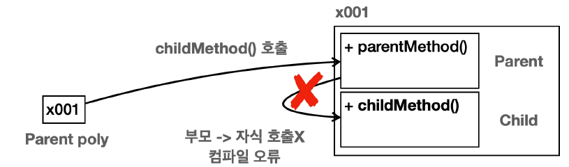 Parent poly = new Child() 처럼 자식 인스턴스를 참조하고 있는 상황에서 poly가 자식 타입인 Child에 있는 childMethod()를 호출하면 어떻게 될까? 부모 타입의 참조변수로 자식 인스턴스를 참조할 수 있다. 하지만 자식의 기능은 호출할 수 없다.