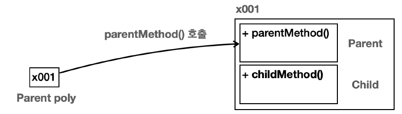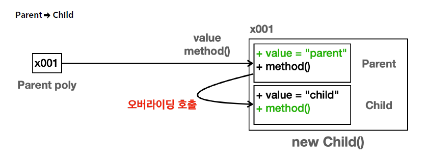 - poly 변수는 Parent 타입이다. 따라서 poly.value, poly.method()를 호출하면 인스턴스의 Parent 타입에서 기능을 찾아 실행한다.