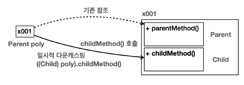 - Child child = (Child) x001 // 이때, poly 자체를 변경하는 것이 아니라 참조값을 꺼내서 읽은 다음 자식 타입으로 지정