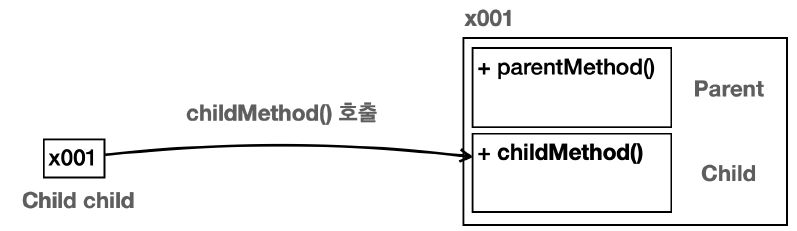 - child.childMethod()를 호출하면 인스턴스의 Child 클래스에 있는 childMethod()가 호출된다.