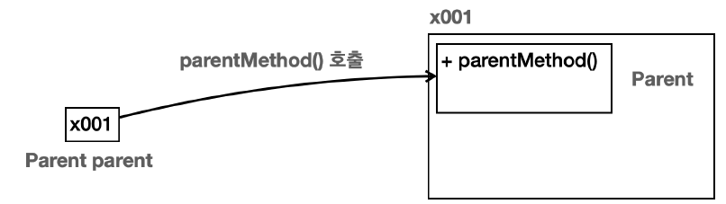 - parent.parentMethod()를 호출하면 인스터스의 Parent 클래스에 있는 parentMethod()가 호출된다.