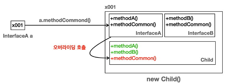 - 변수 a가 InterfaceA 타입이므로 해당 타입에서 methodCommon()을 찾는다.