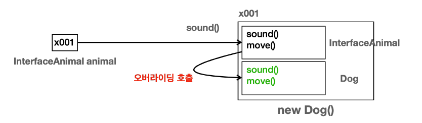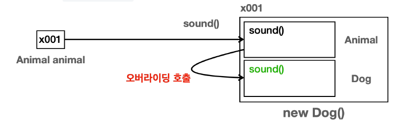 - animal 변수의 타입은 Animal 이므로 Dog 인스턴스에 있는 Animal 클래스 부분을 찾아서 sound() 메서드를 실행한다. 그런데 하위 클래스인 Dog에서 sound() 메서드를 오버라이딩 했다. 따라서 오버라이딩한 메서드가 우선권을 갖는다.