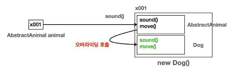 - 호출한 animal 변수는 AbstractAnimal 타입이다. 따라서 AbstractAnimal.sound()를 찾는다. 해당 메서드는 오버라이딩 되었기 때문에 Bird.sound()가 호출된다.