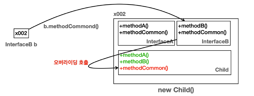 - 변수 b가 InterfaceB 타입이므로 해당 타입에서 methodCommon()을 찾는다.