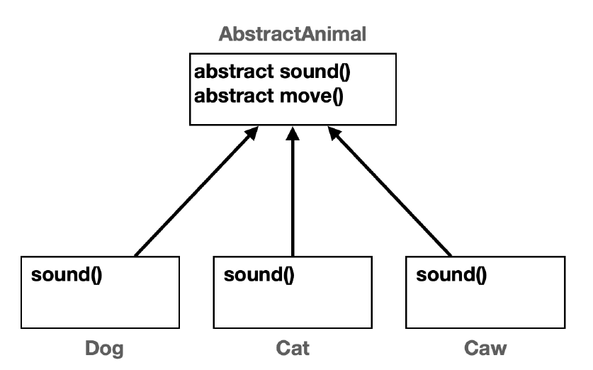 AbstractAnimal의 모든 기능을 자식 클래스에서 오버라이딩 해야한다. 대상 타입을 찾을 때는 호출자의 타입을 기준으로 선택한다. 처음 호출자의 타입으로 선택 후 오버라이딩을 호출한다.