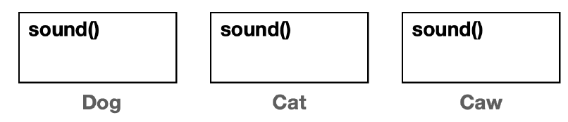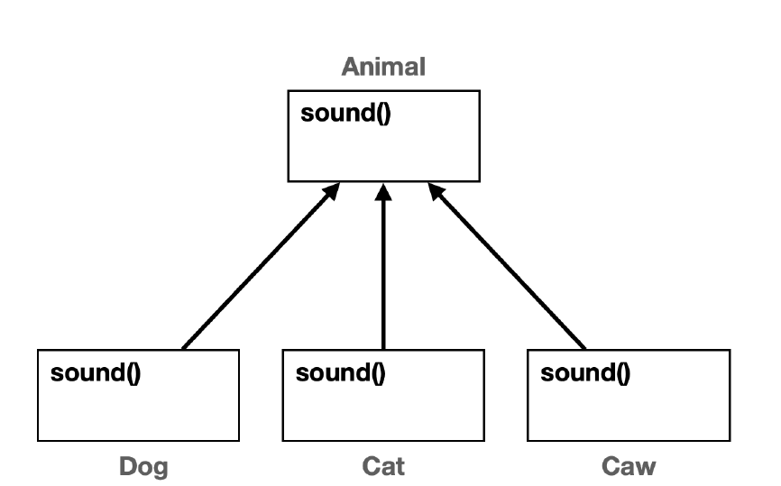 다형성을 활용하기 위해 Animal(동물) 부모 클래스를 만들고 sound() 메서드를 정의한다. 그리고 이 메서드는 자식 클래스에서 오버라이딩 된다.
