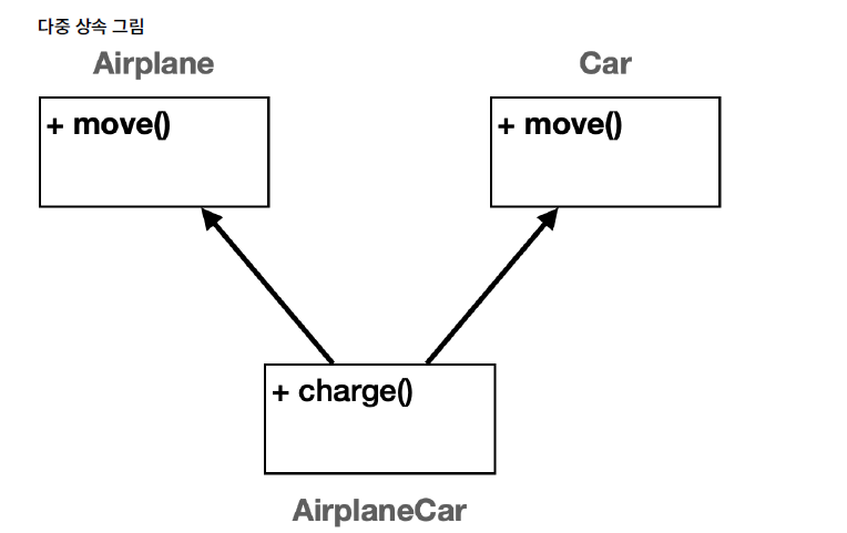 자바는 다중 상속을 지원하지 않는다. AirplaneCar입장에서 move()를 호출할 때, 어떤 부모의 move()를 사용해야할지 애매한 문제가 발생하는데 이를 '다이아몬드' 문제라고한다. 그리고 다중 상속을 사용하면 클래스 계층 구조가 매우 복잡해 질 수 있다. 그렇기 때문에 자바는 클래스의 다중 상속을 허용하지 않는다. 대신 인터페이스의 다중 구현을 허용하여 이러한 문제점을 예방한다.