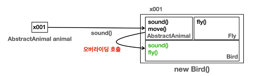 - animal.sound()를 호출하면 참조 대상인 x001 Bird 인스턴스를 찾는다.