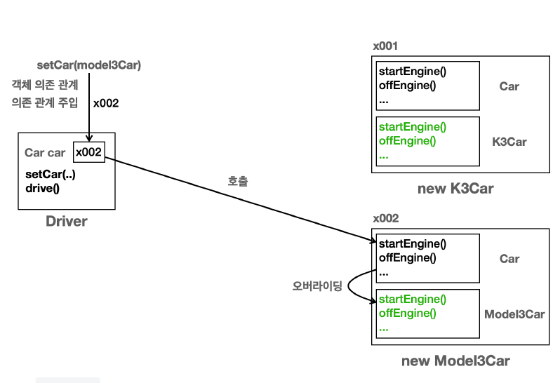 - driver.drive()를 호출하면 x001을 참조한다. car 필드가 Car 타입이므로 Car 타입을 찾아서 실행하지만 메서드 오버라이딩에 의해 K3Car의 기능이 호출된다.