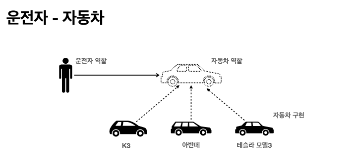 - 운전자(Driver)는 Car의 역할에만 의존한다. 구현인 K3, Model3 자동차에 의존하지 않는다.