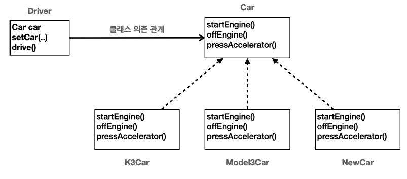 - 의존은 클래스 의존 관계를 뜻한다. 즉 클래스 상에서 어떤 클래스를 알고 있는가를 뜻한다. Driver 클래스 코드를 보면 Car 인터페이스만 사용하는 것을 알 수 있다.