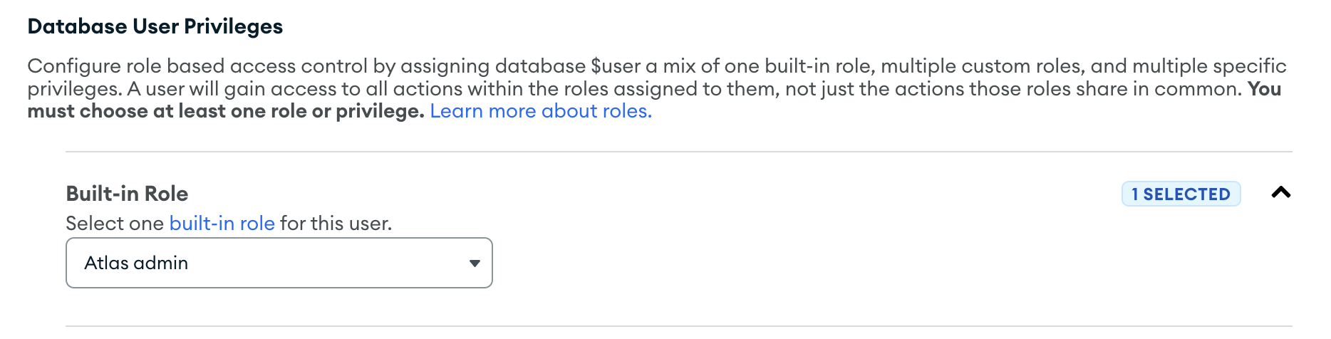 처음에는 Buili-in Role 부분이 아무것도 설정이 되어있지 않을 것이다. 이부분을 Atlas admin으로 설정을 해주면 문제를 해결할 수 있다.