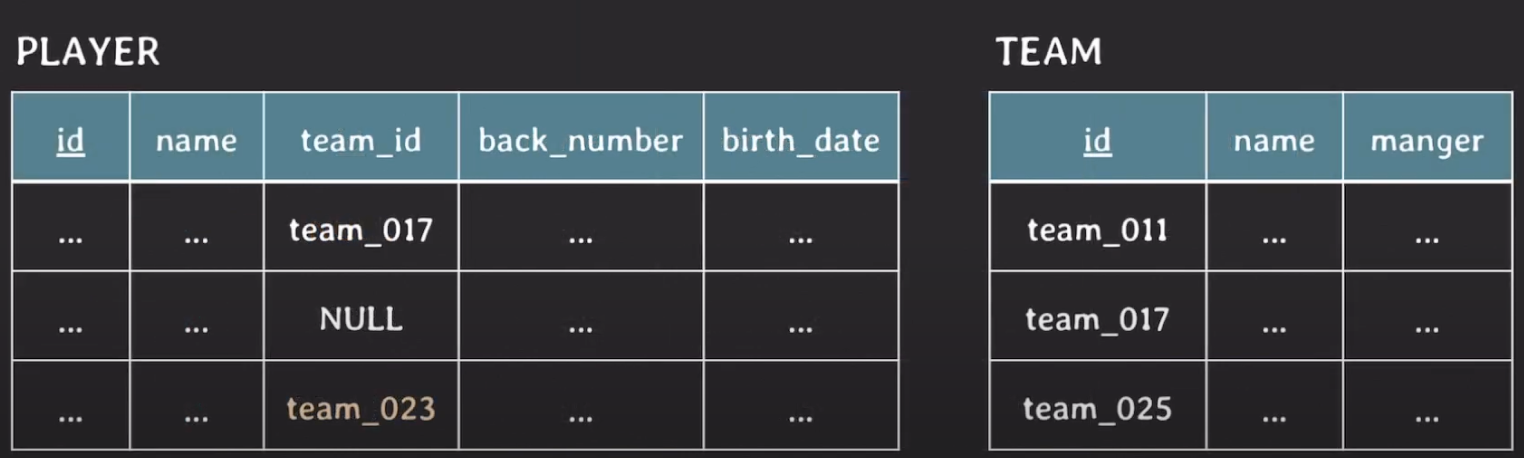 - referential integrity constraint: FK(Foreign Key)와 PK는 도메인이 같아야하고 PK에 없는 값들을 FK가 값으로 가질 수 없다. 아래는 TEAM relaion의 프라이머리 키인 id에 없는 값인 team_023을 FK인 PLAYER relation의 team_id가 가지고 있기 때문에 제약사항을 어긴것이다.