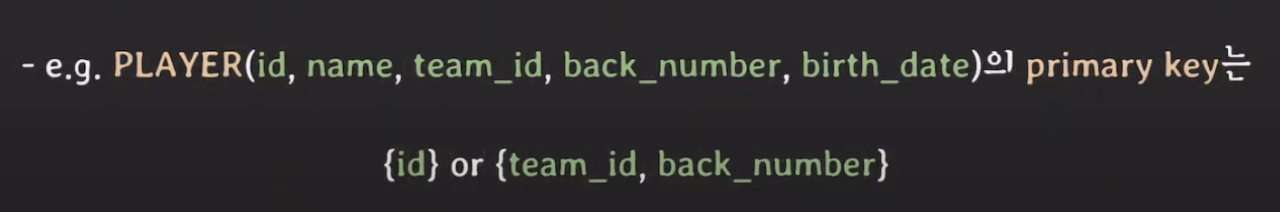 위 예시에서 id를 갖고 튜플들을 식별하고자 한다면 id가 프라이머리 키가 되는것이고 그게 아니라 팀 아이디와 등 번호로 튜플들을 식별하고자 한다면 이 두 개가 프라이머리 키가 된다!