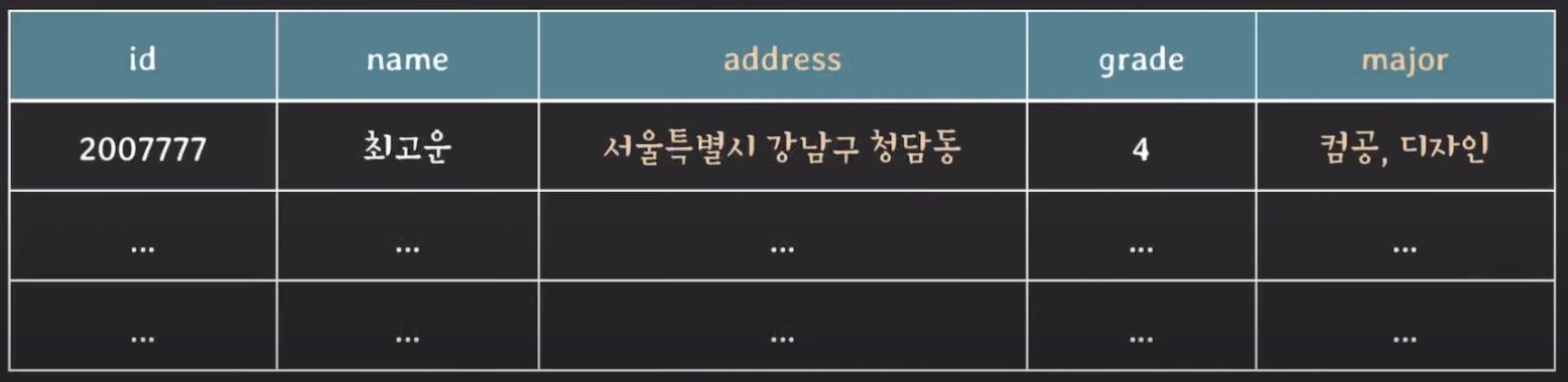 attribute는 atomic 즉 더 이상 나눠질 수 없는 형태로 해야한다. 즉 composite or multivalued attribute 허용안된다. ❗️즉, 아래 사진에서 address에서 서울특별시, 강남구, 청담동을 모두 나눠줘야지 함께 사용하면 안된다. major에서도 컴공과 디자인을 나눠줘야한다.