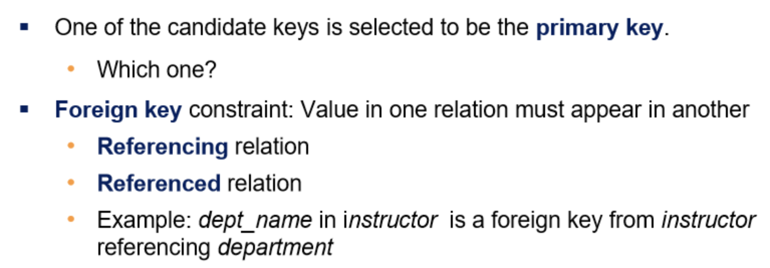- entity integrity constraint: primary key는 value에 null을 가질 수 없다. 왜냐하면 프라이머리 키는 튜플을 유니크하게 만들기 위함인데 값이 null이면 더 이상 튜플을 유니크하게 식별할 수 없다.