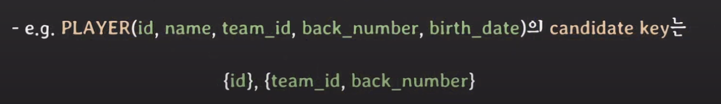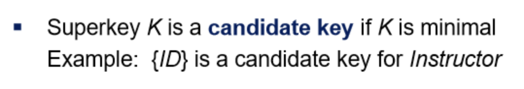 어느 한 attribute 라도 제거하면 unique하게 튜플들을 식별할 수 없는 superkey -> key or minimal superkey