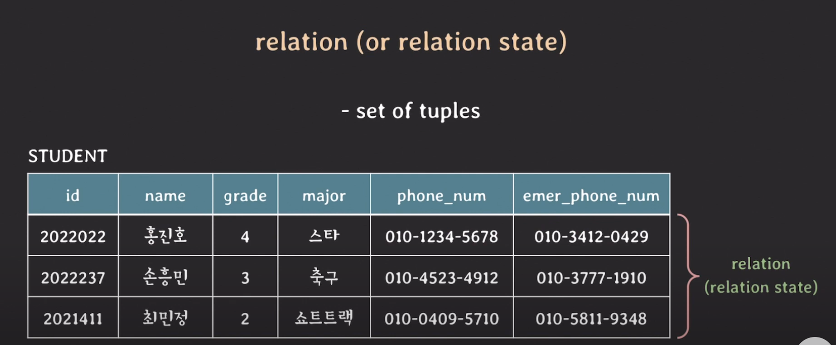 - relation schema: relation 스키마란 relatoin의 구조를 나타낸다. 예를들어 relation의 이름과 attributes 리스트를 표기하면 STUDENT(id, name, grade, major, phone_num, emer_phone_num)과 같이 표현할 수 있고, 따로 표기는 하지 않지만 attributes와 관련된 constraints도 포함한다.