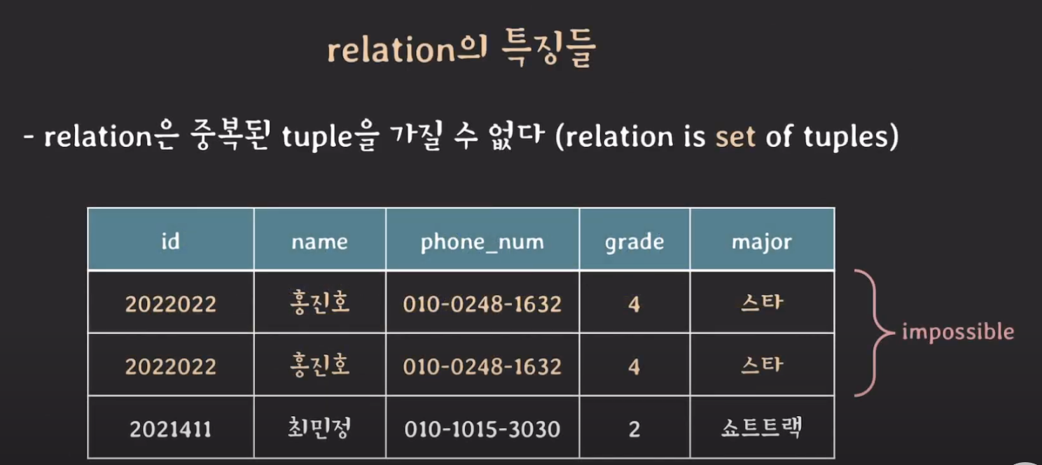 먼저 relation의 특징들에 대해서 알아보면, relation은 중복된 tuple을 가질 수 없다. 왜냐하면 relation is set of tuples