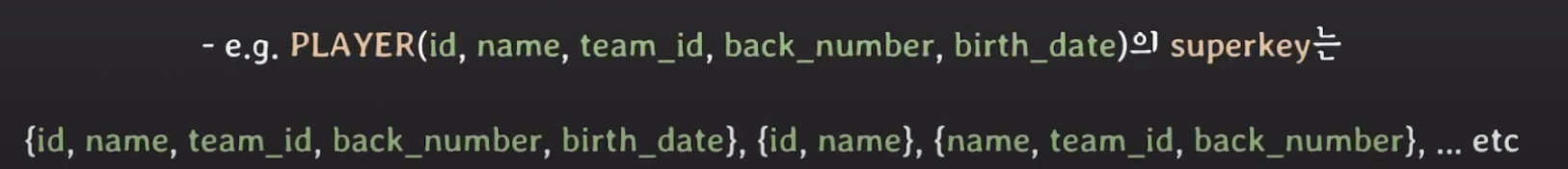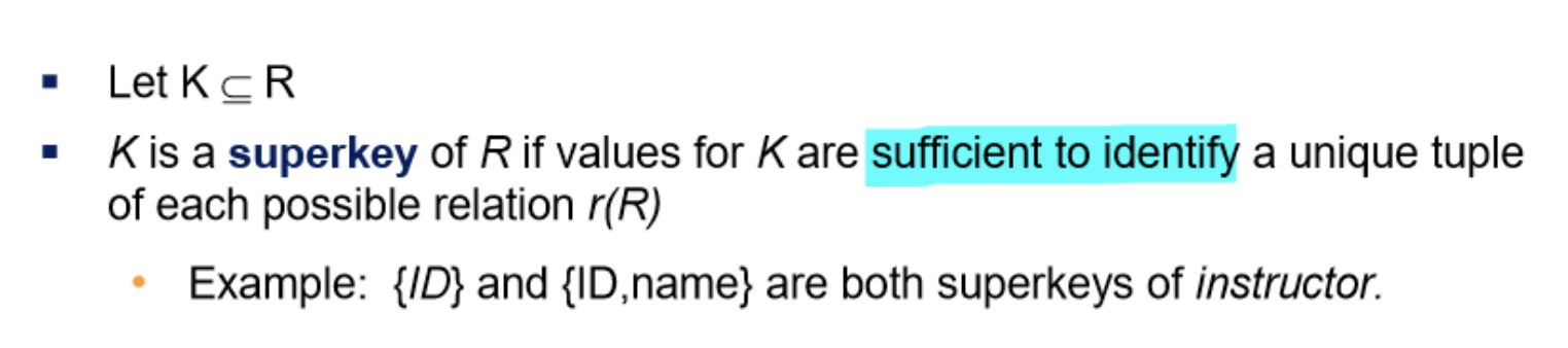 수퍼 키는 relation에서 tuples를 unique하게 식별할 수 있는 attributes set을 의미한다. superkey는 유니크한 식별을 만족한다면 여러가지가 될 수 있다.