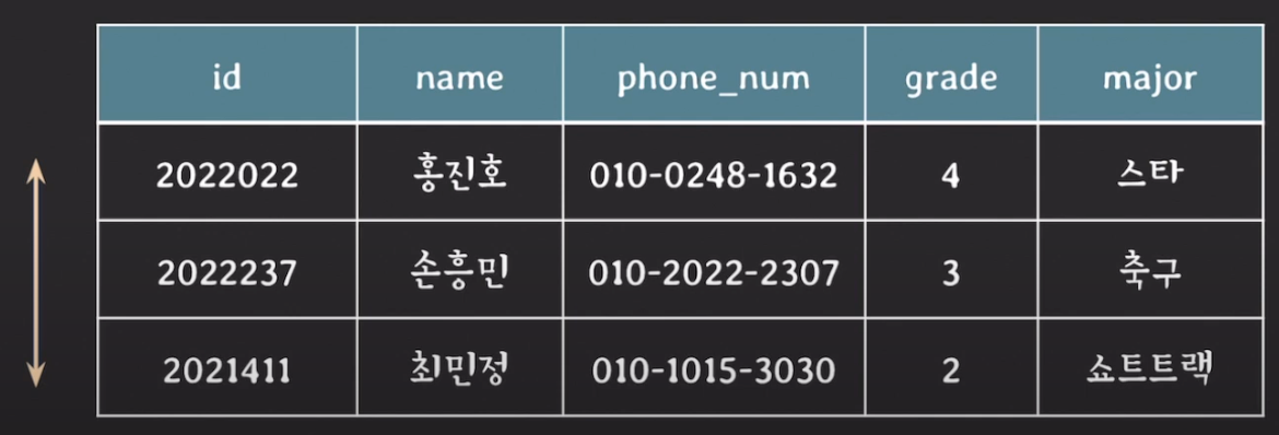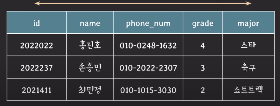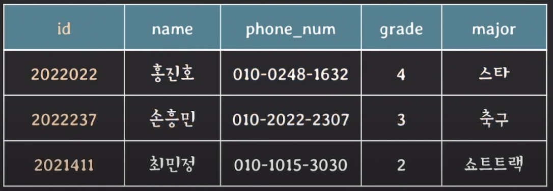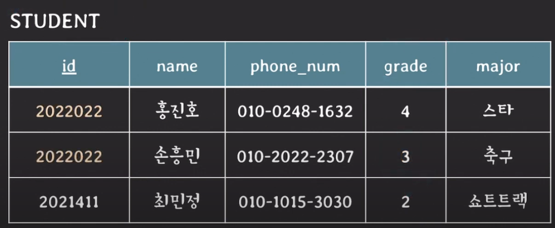 - key constraints: 서로 다른 튜플은 같은 값의 key를 가질 수 없다. 아래와 같인 홍진호와 손흥민은 서로 다른 튜플인데 키값이 같기 때문에 제약사항을 지키지 못한 예이다.